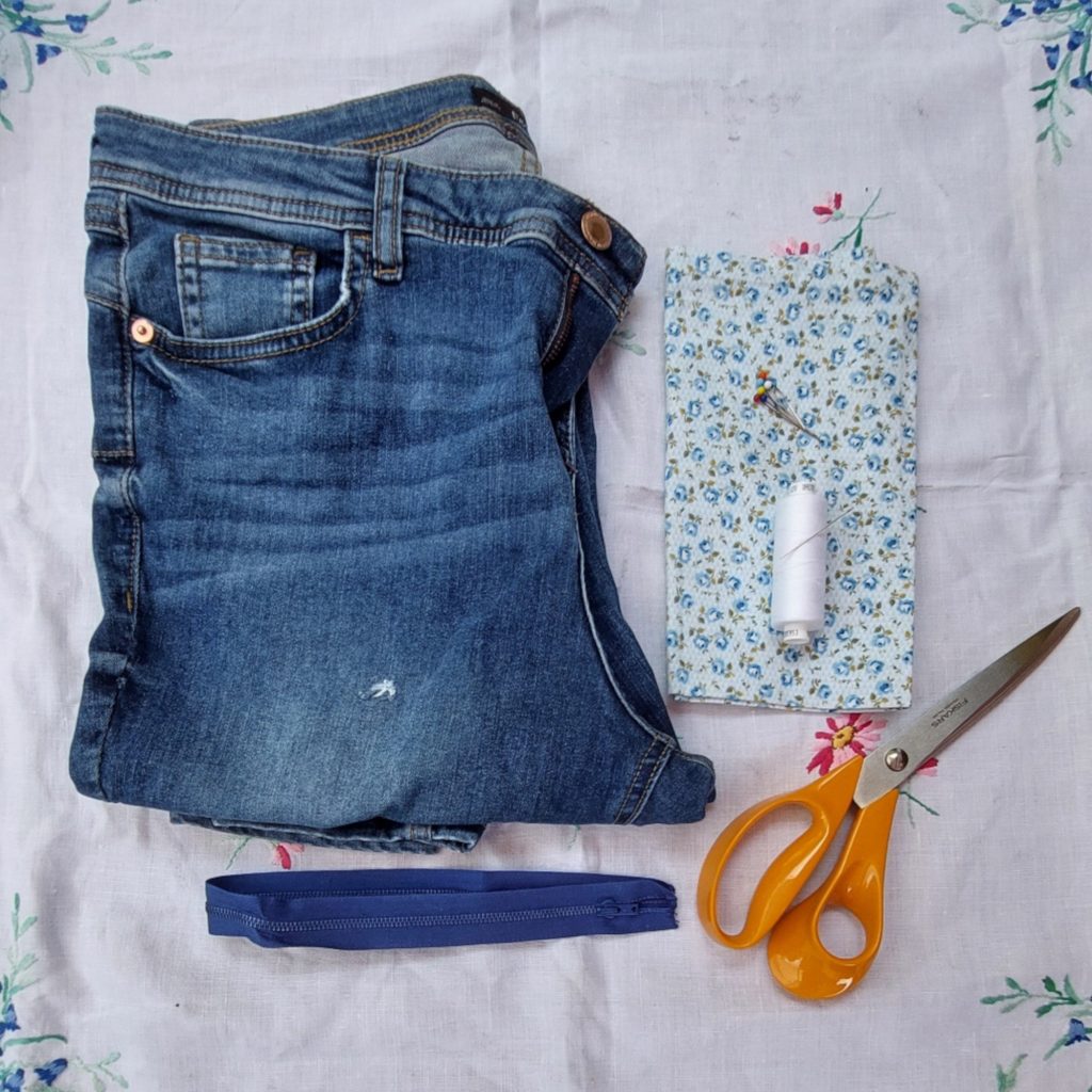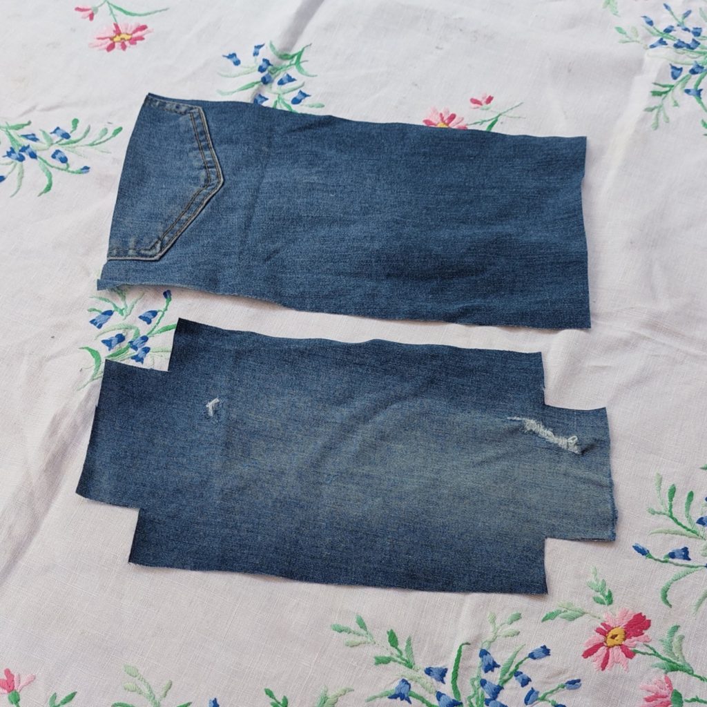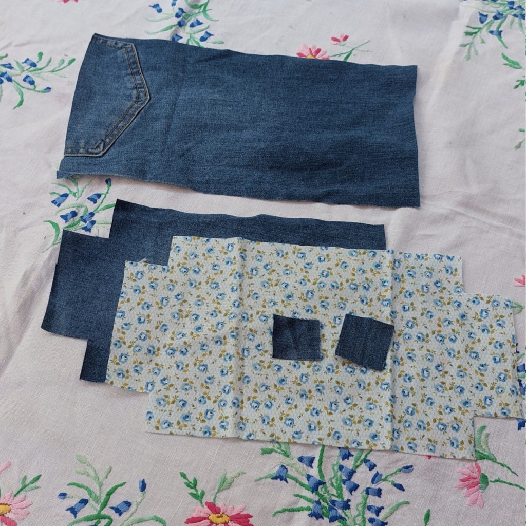 First step is to cut the jeans and the cotton fabric out. You will need two pieces of each, measuring 31cm x 16cm.