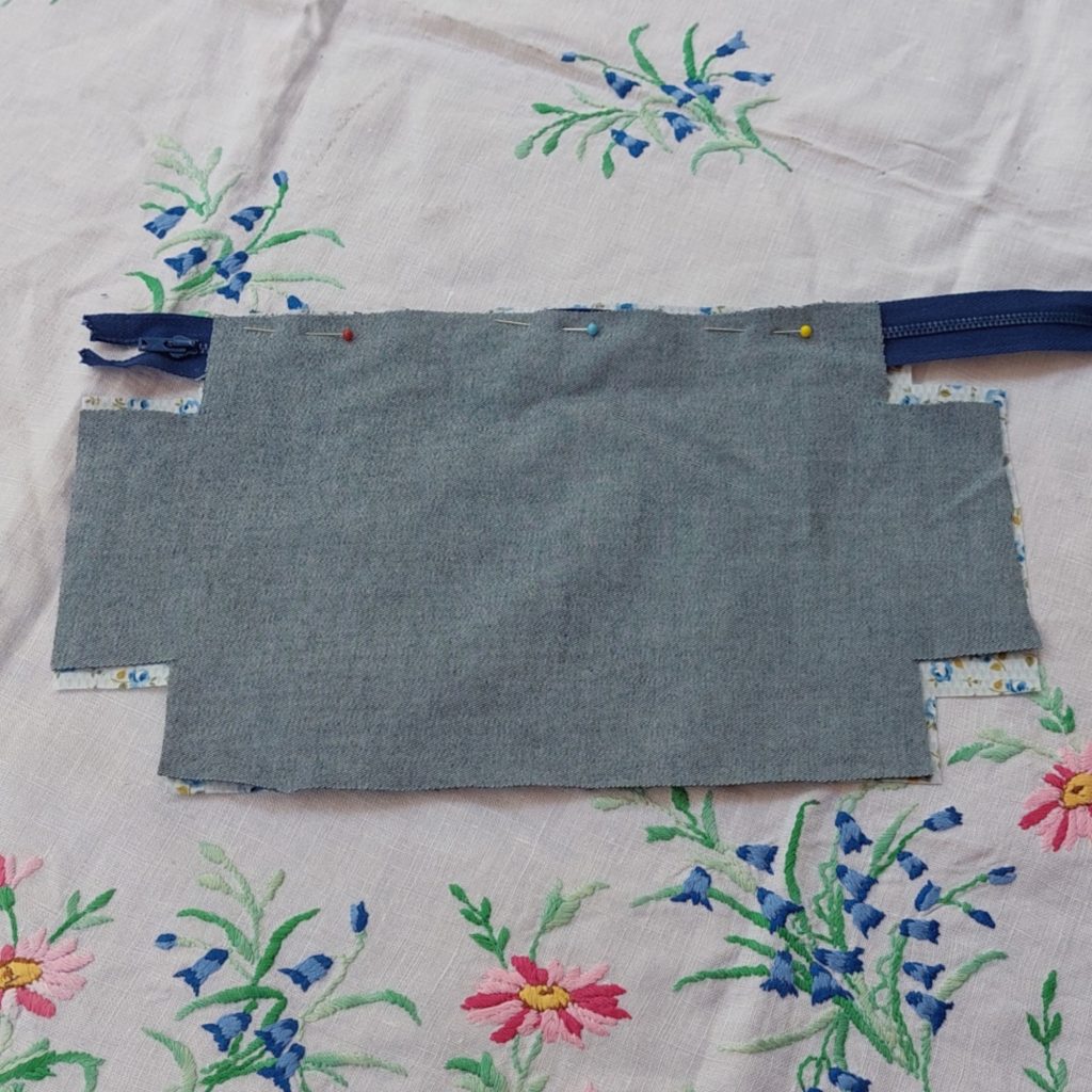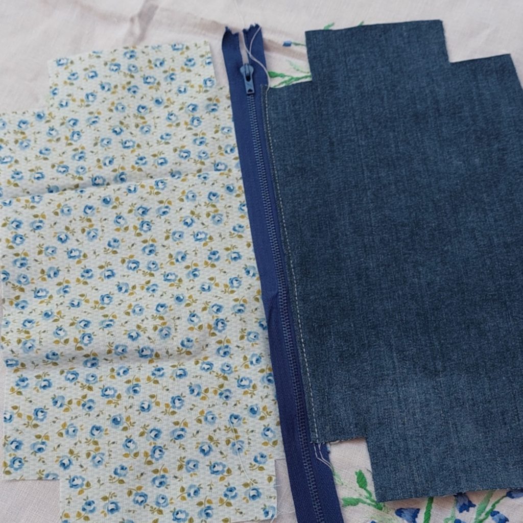 Lay the zip out with the zip pull to the left, right side face up. Lay the first piece of denim right side face down on the zip edge. Turn over and pin the cotton piece, right side facing down. Sew along the edge in place.