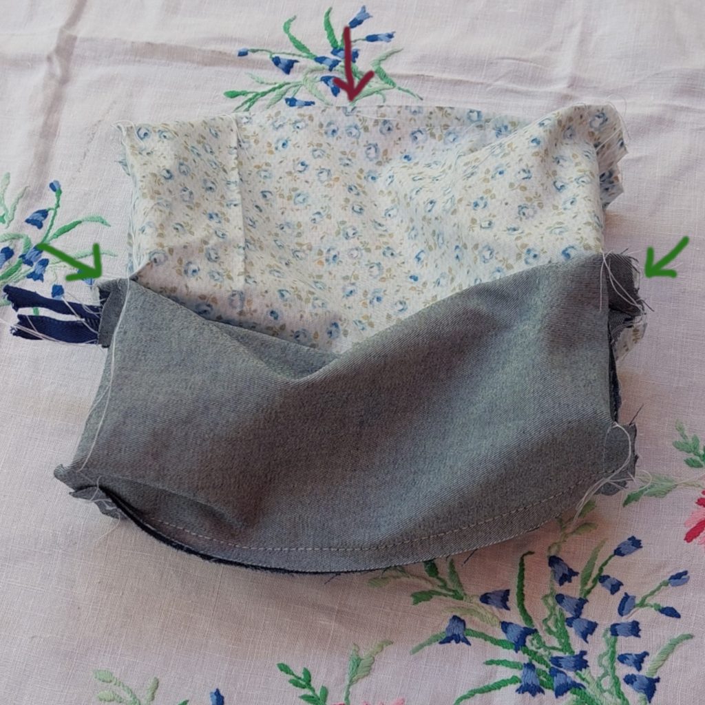 Now sew the cotton and denim across the zip, to form the other box area (green arrows). Then open out/bag out using the gap you left in the cotton fabric (red arrow).