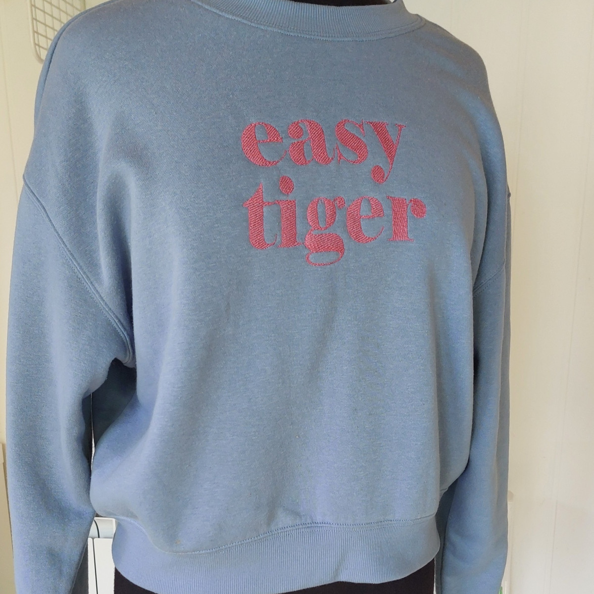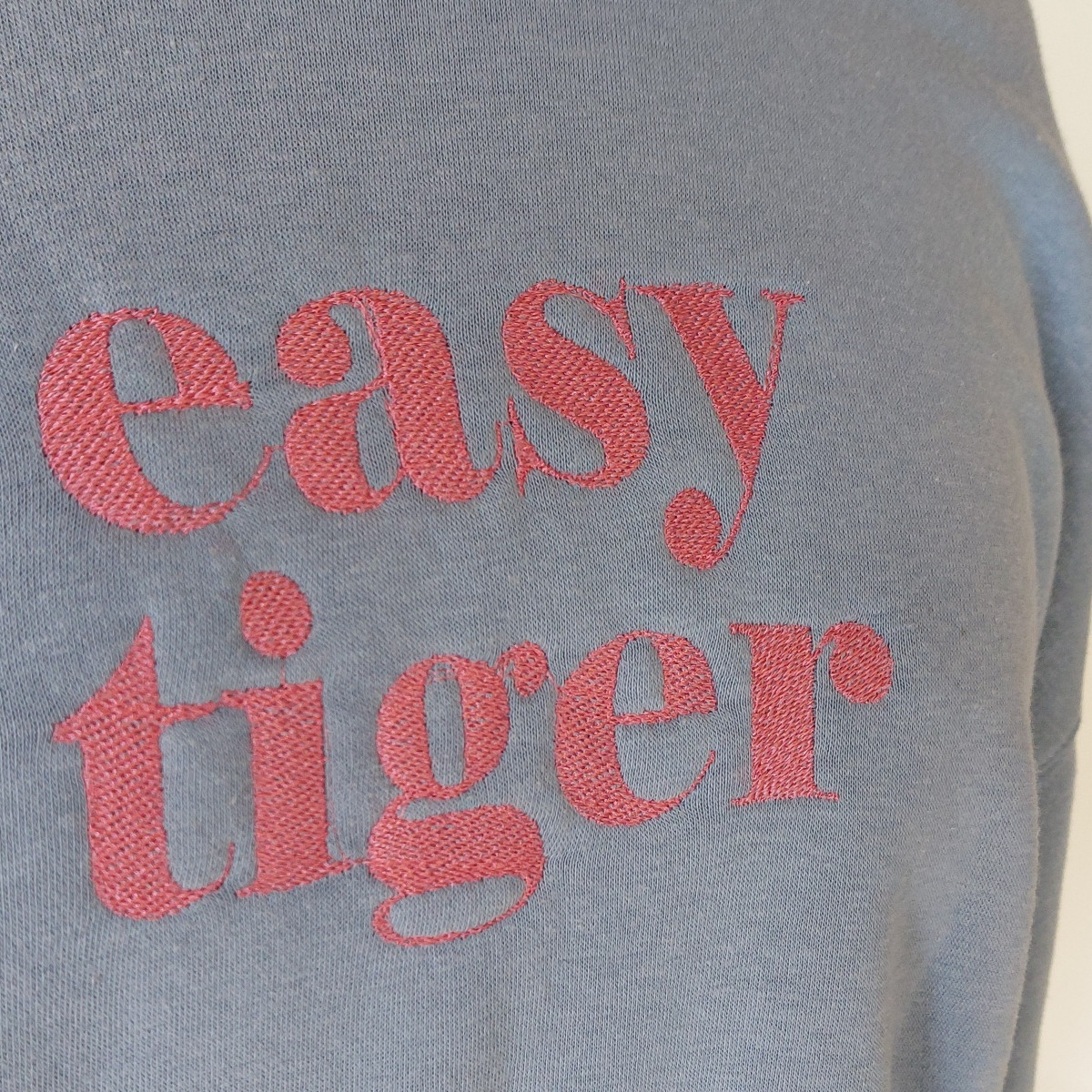 This upcycled hoodie is a fun and thoughtful gift idea with a sustainable twist. Each piece is carefully sourced from deadstock, or pre-loved sweatshirts and hoodies – clothing that would otherwise be destined for landfill or incineration. After rescuing these garments, we refresh them and add unique embroidered slogans, like ‘Easy Tiger’, to give them a new life.